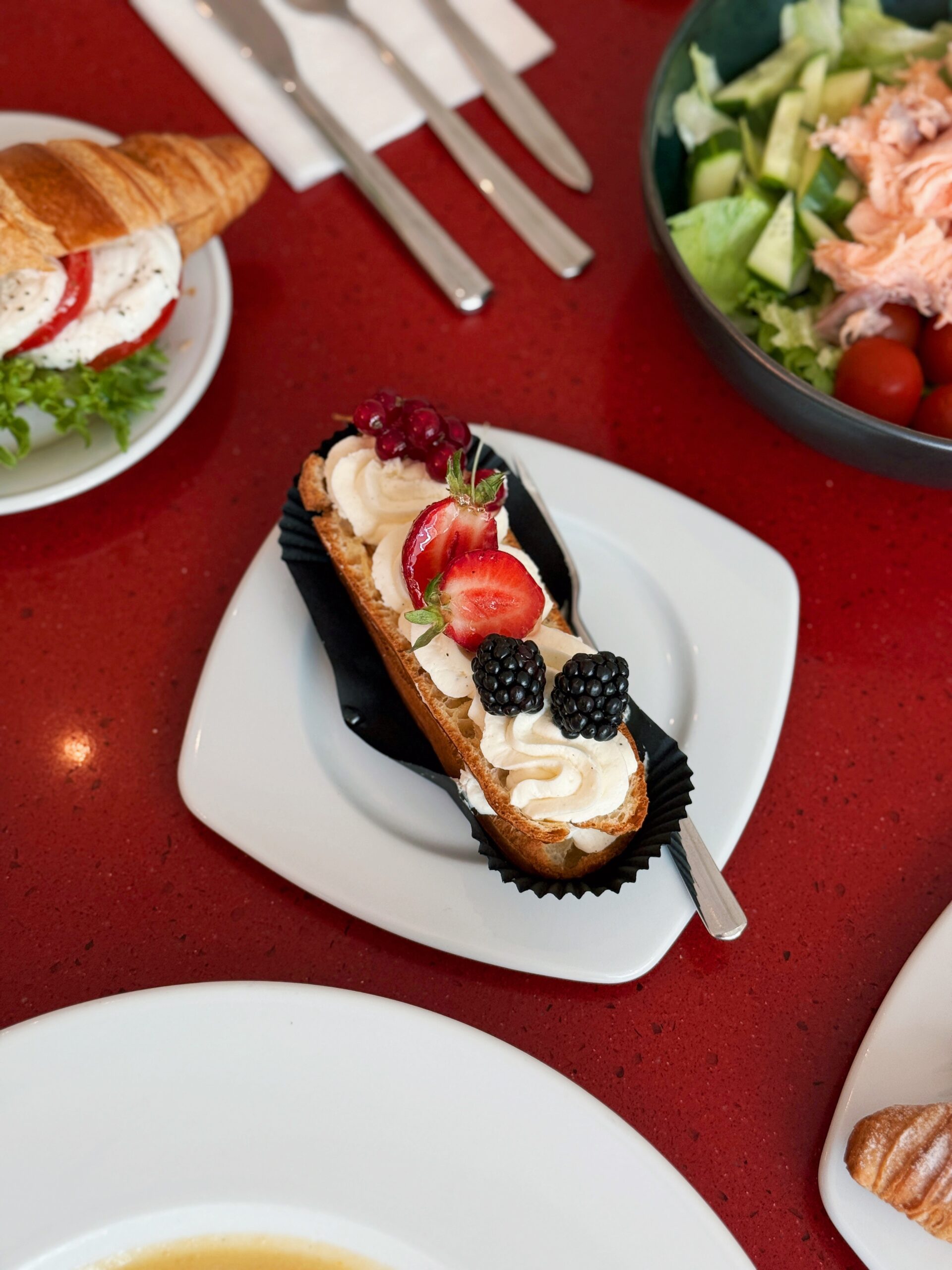 – eclair with cream cheese and berries,