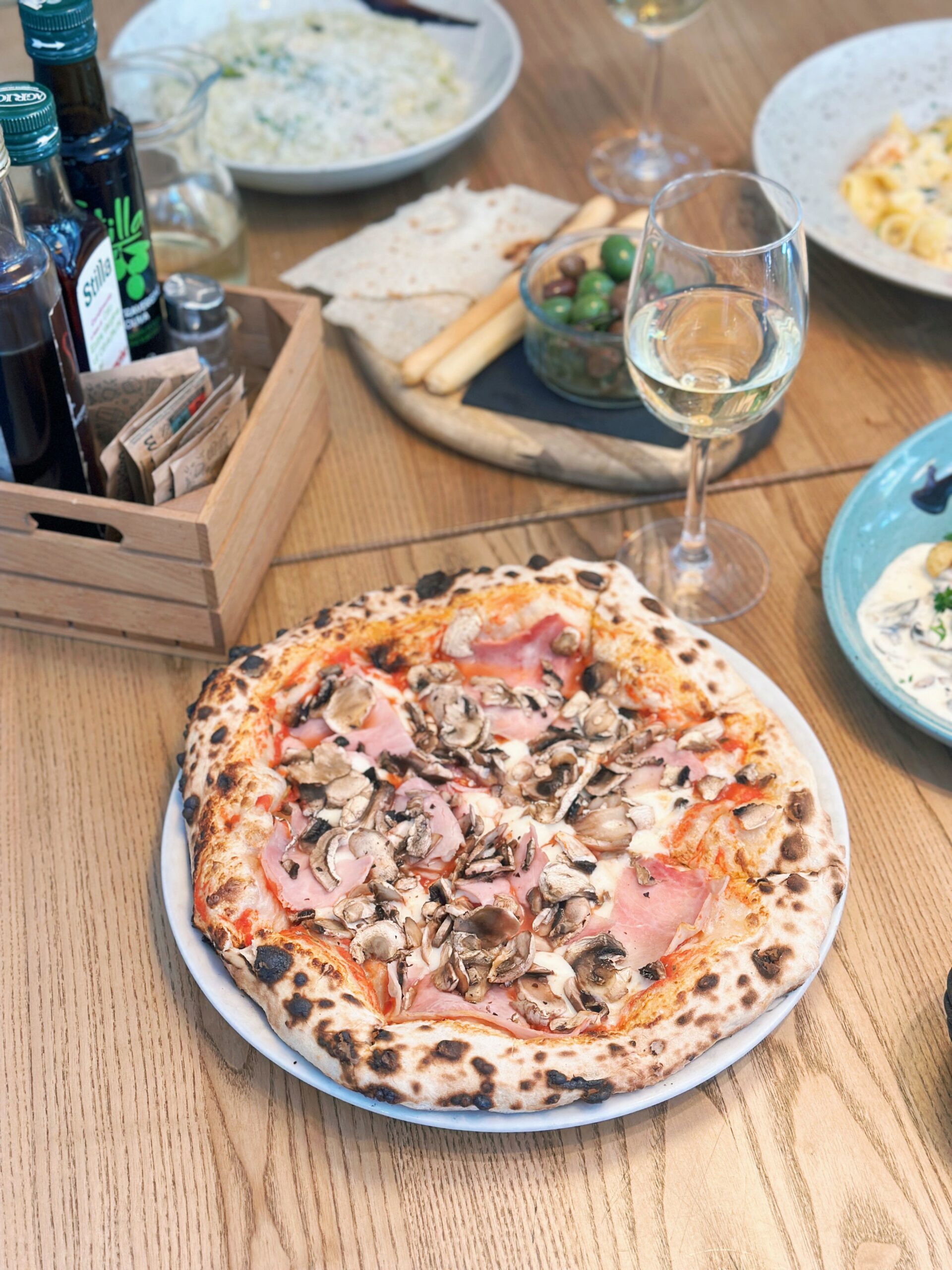 – pizza with prosciutto and mushrooms.