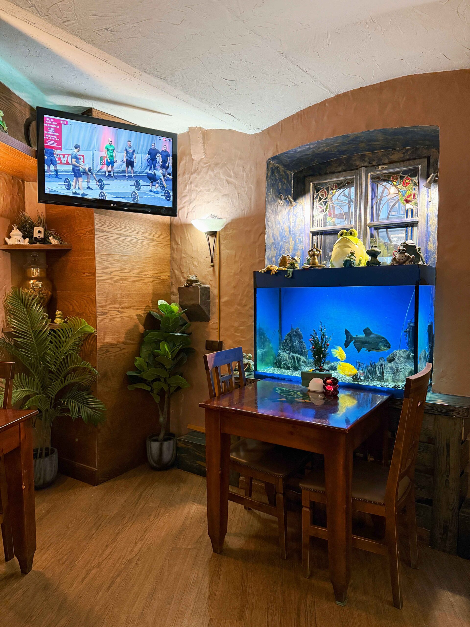 Seest leiate avara ruumi, mis on jagatud mitmeks tsooniks: baar, peasaal ja kaminaruum. Kaminaruumis on lastele mänguala. Interjöör uhkeldab ainulaadse originaalse disaini, ajalooliste elementide ja kauni valgustusega. Tellimust oodates proovige leida kõik konnad, kes riiulitel ja niššides pesitsevad.