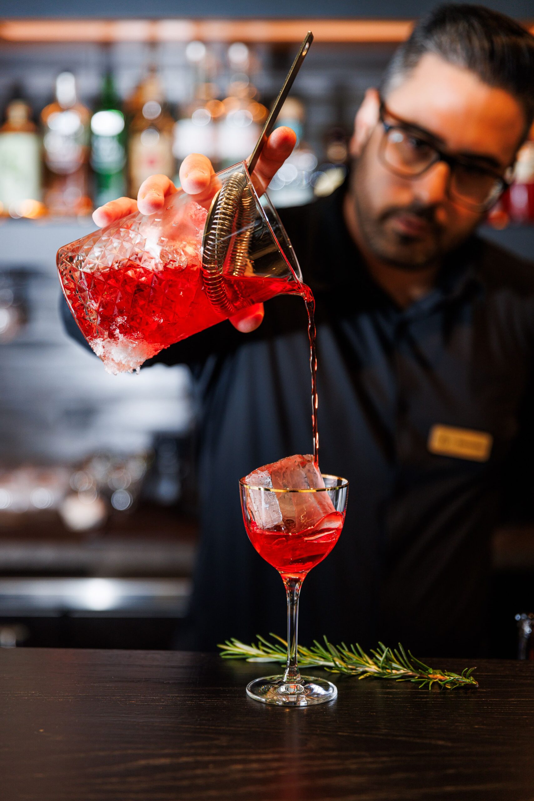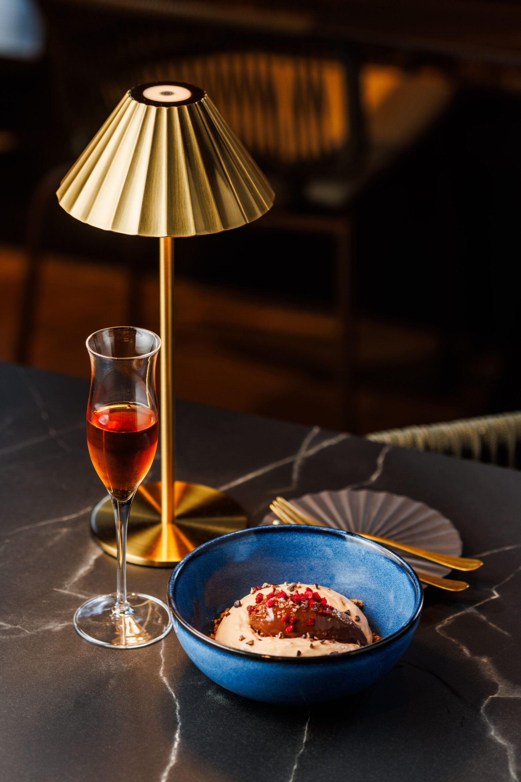 The restaurant has a rich wine list embracing white, red, rose, or sparkling wine from Italy, Spain, France, Germany, New Zealand, Argentina, and other countries. Some of the wines can be seen exhibited on the stylish red shelf; this appealing accent in the interior of Kolm Sibulat definitely catches the eye.