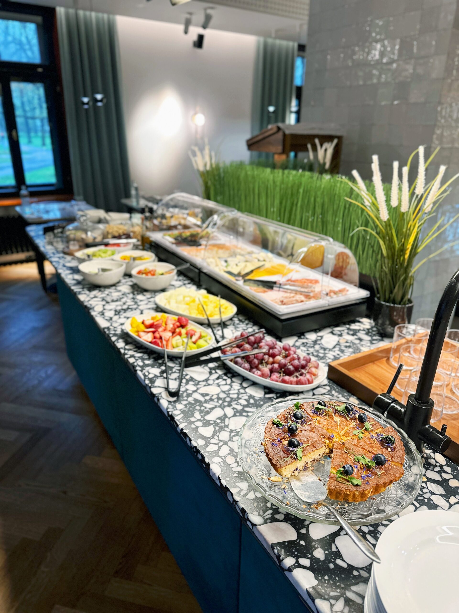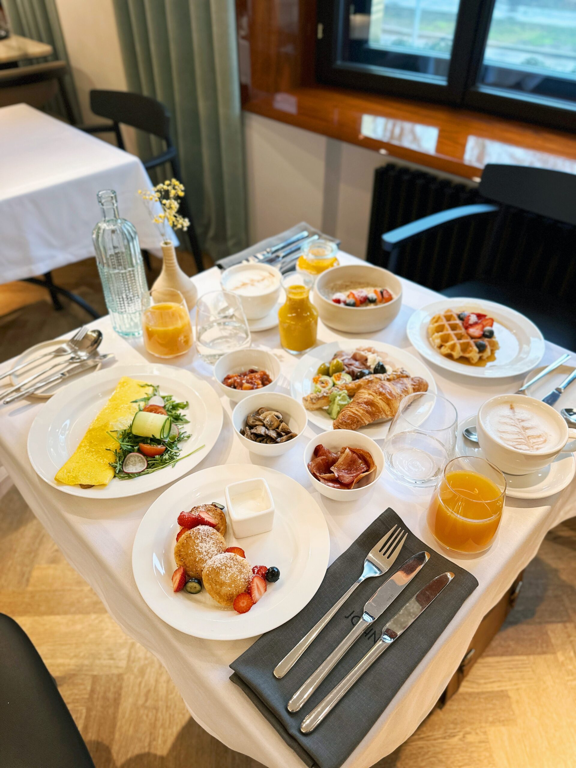 Rytais restorane patiekiami gausūs pusryčiai iš meniu – kiekvienas patiekalas gražiai patiekiamas individualiai kiekvienam svečiui.