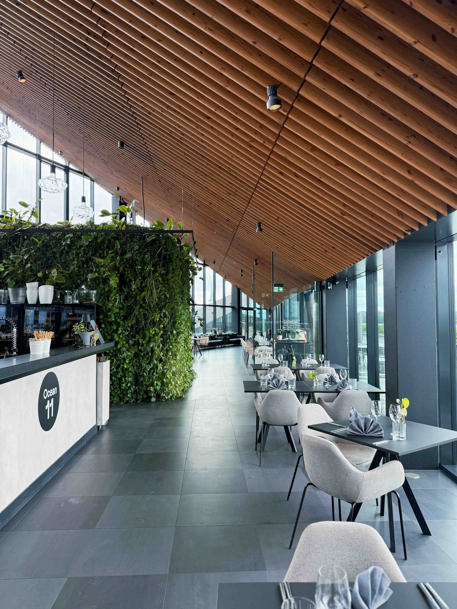 “Ocean 11” suprojektuotas taip, kad svečiai galėtų visapusiškai mėgautis panoraminiu Talino ir jo pakrantės vaizdu. Per aukštus langus nuo grindų iki lubų patalpą užpildo natūrali šviesa, o vasarą ši vieta ypač vertinama dėl galimybės stebėti kvapą gniaužiančius jūros saulėlydžius. Restorane yra dvi nuostabios terasos.