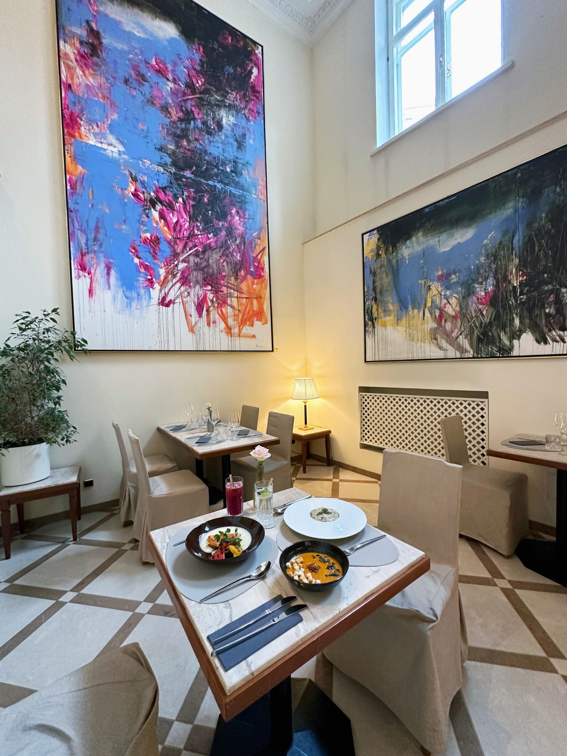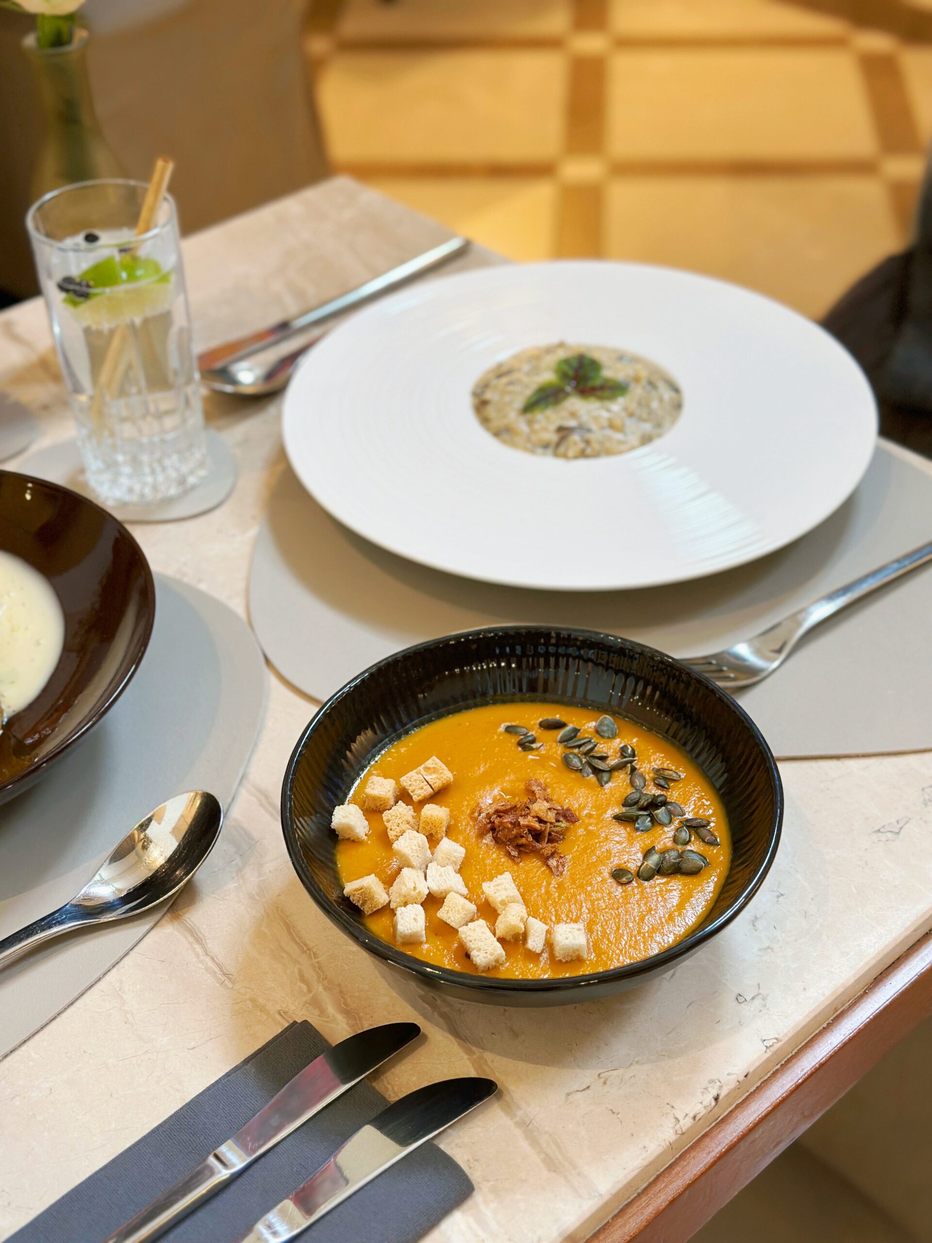 Dish presentations deserve special praise as the appearance of each turns into a small gastronomic show. For example, you don’t just get served with a bowl of soup: the waiter pours it to your plate exquisitely right in front of you instead.