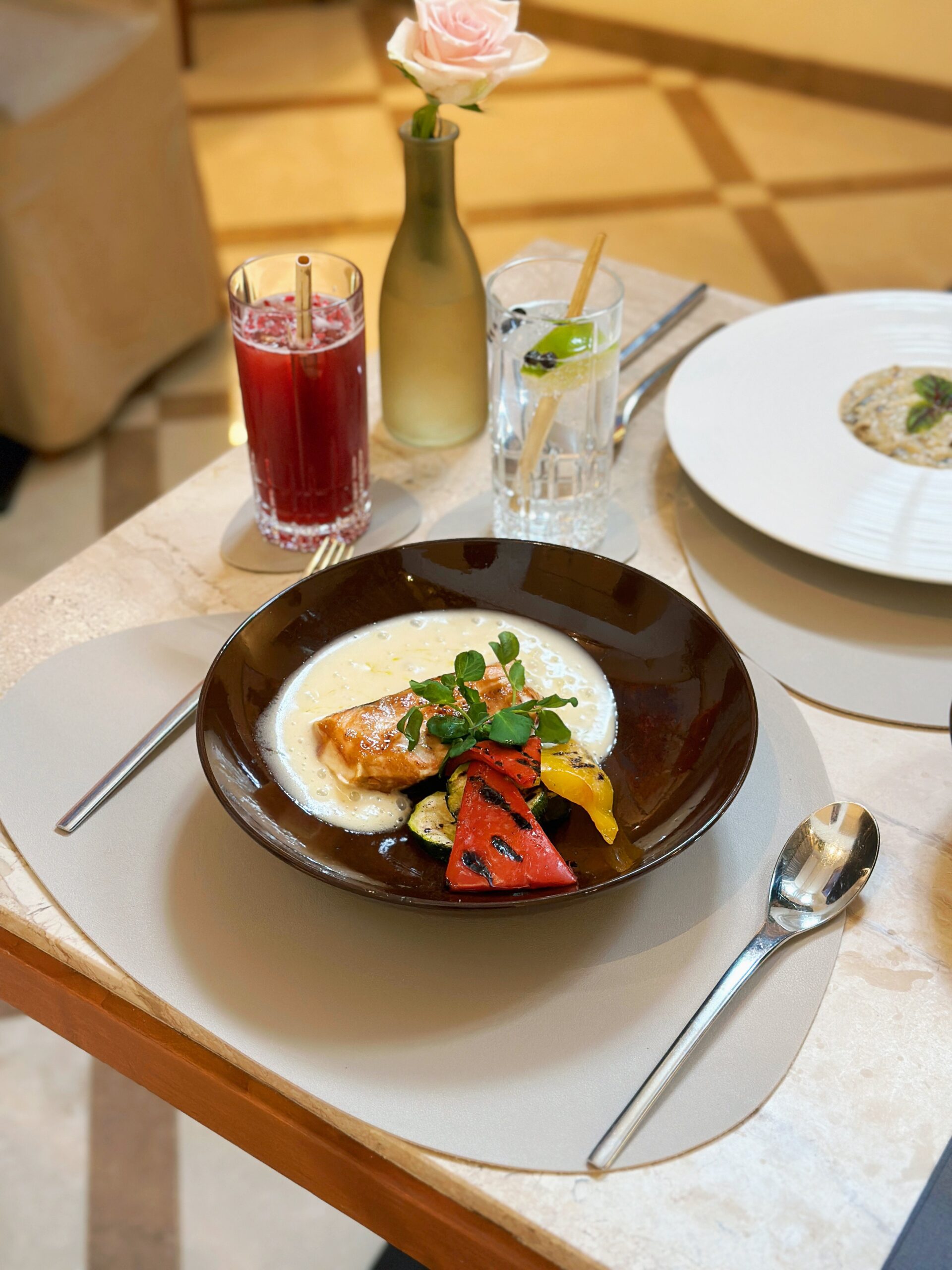 – salmon with béarnaise foam, tomatoes and grilled vegetables,