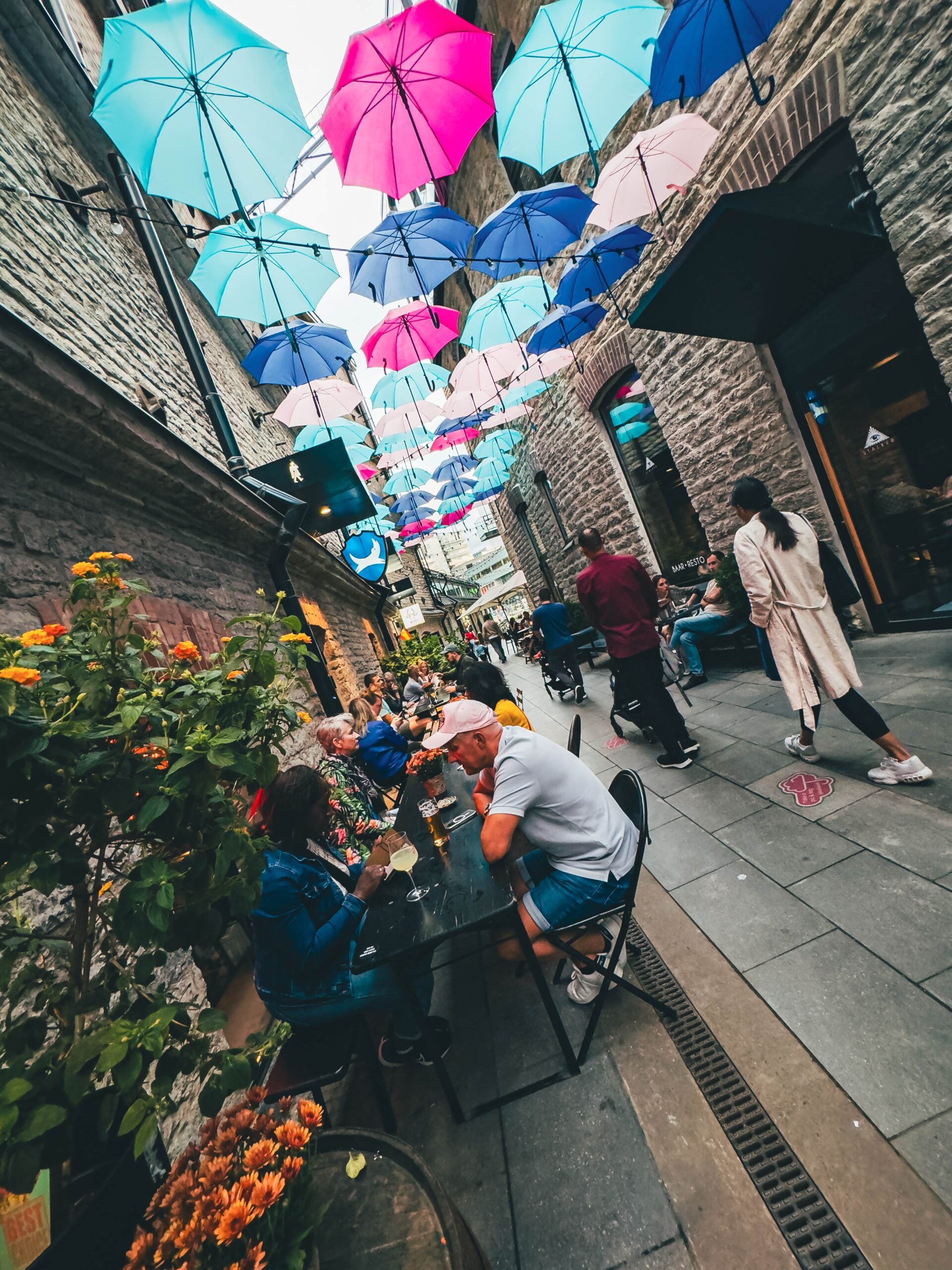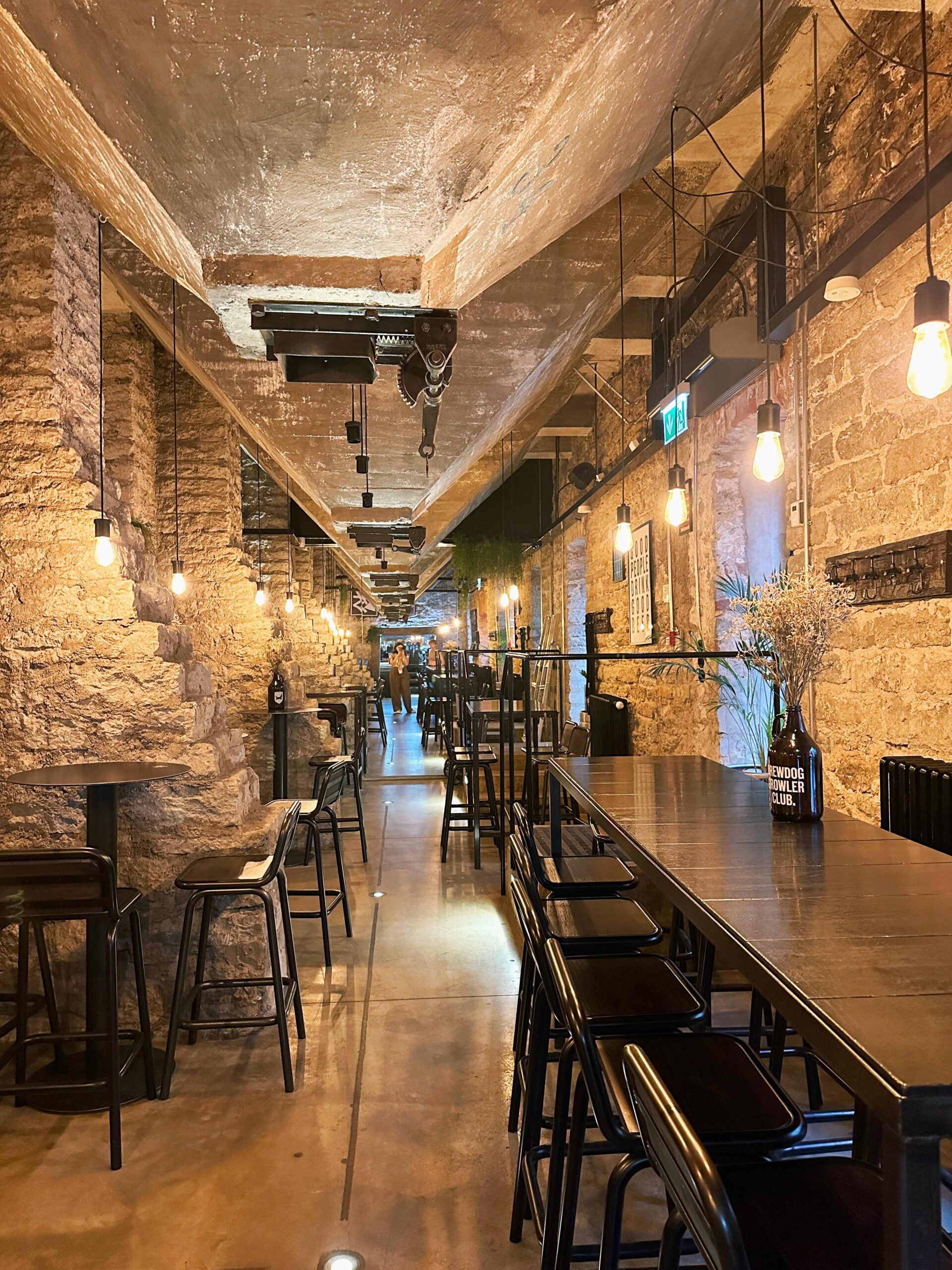 The bar is located in a historical building, which is also reflected in the interior: rough brick walls are complemented by metal shelves, designer lamps and other curious elements, creating a loft atmosphere. In summer, you can enjoy food and drinks on the terrace, which also has an unusual decor: a “ceiling” made of umbrellas.