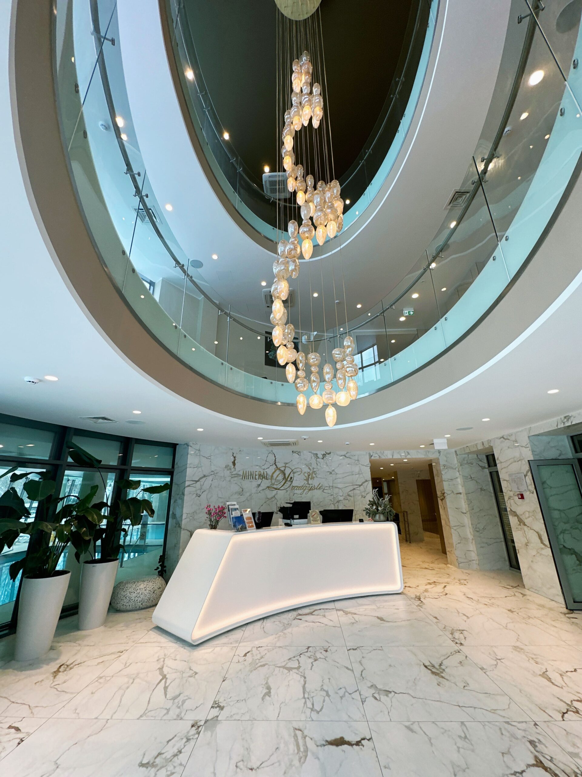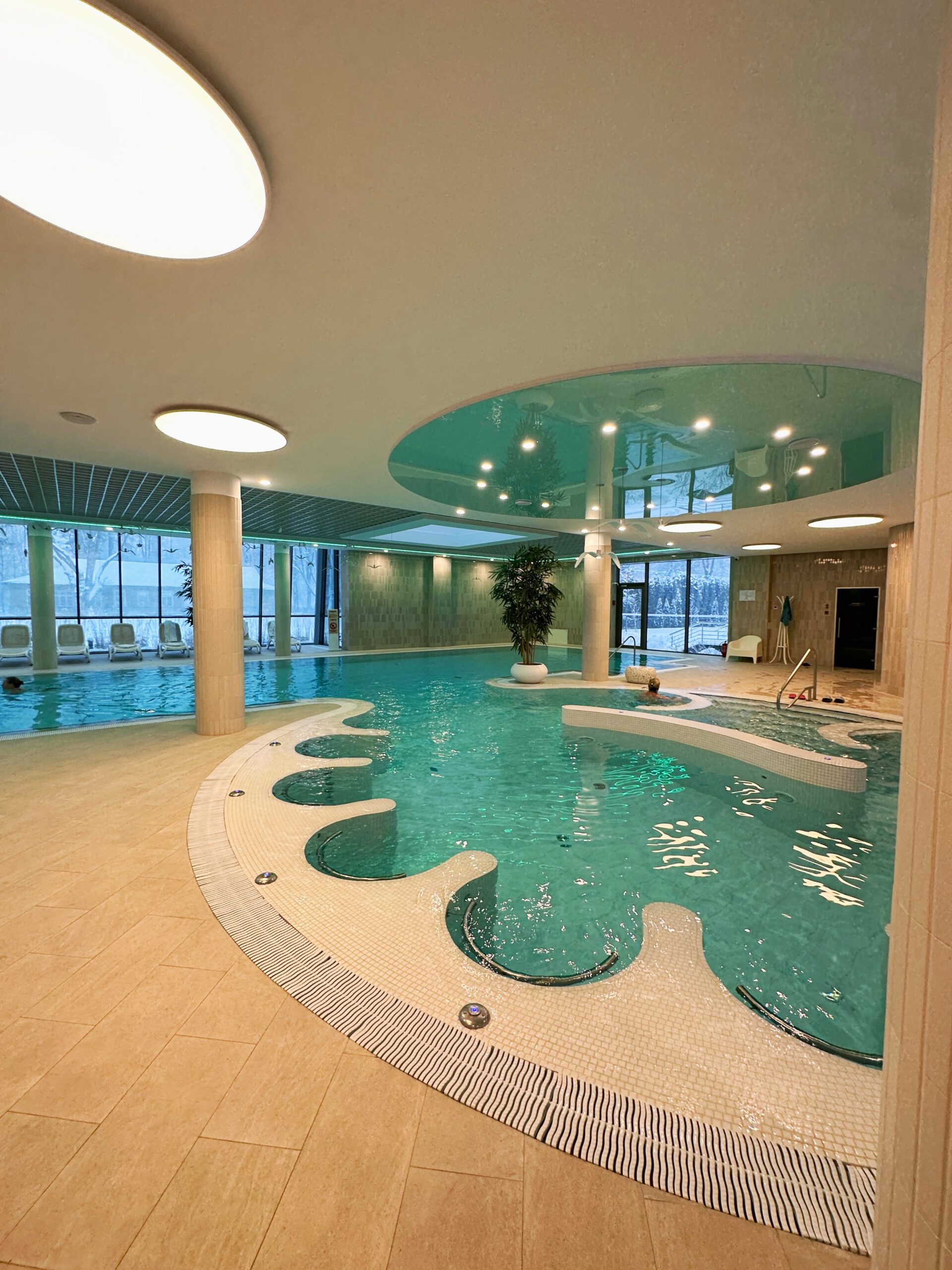 В СПА-центре гостей ждет большая эстетичная зона водной релаксации. Благодаря большим окнам помещение наполнено естественным светом, и вы можете наслаждаться природными видами, плавая в бассейне с водой высокой минерализации. Помимо бассейна, вас ждут вихревая ванна, бани и вертикальные ванны, а также множество лечебных ванн: сероводородные, жемчужные углекислые, ванны с лекарственными травами, скипидарные и озоновые, а также грязевые ванны.
