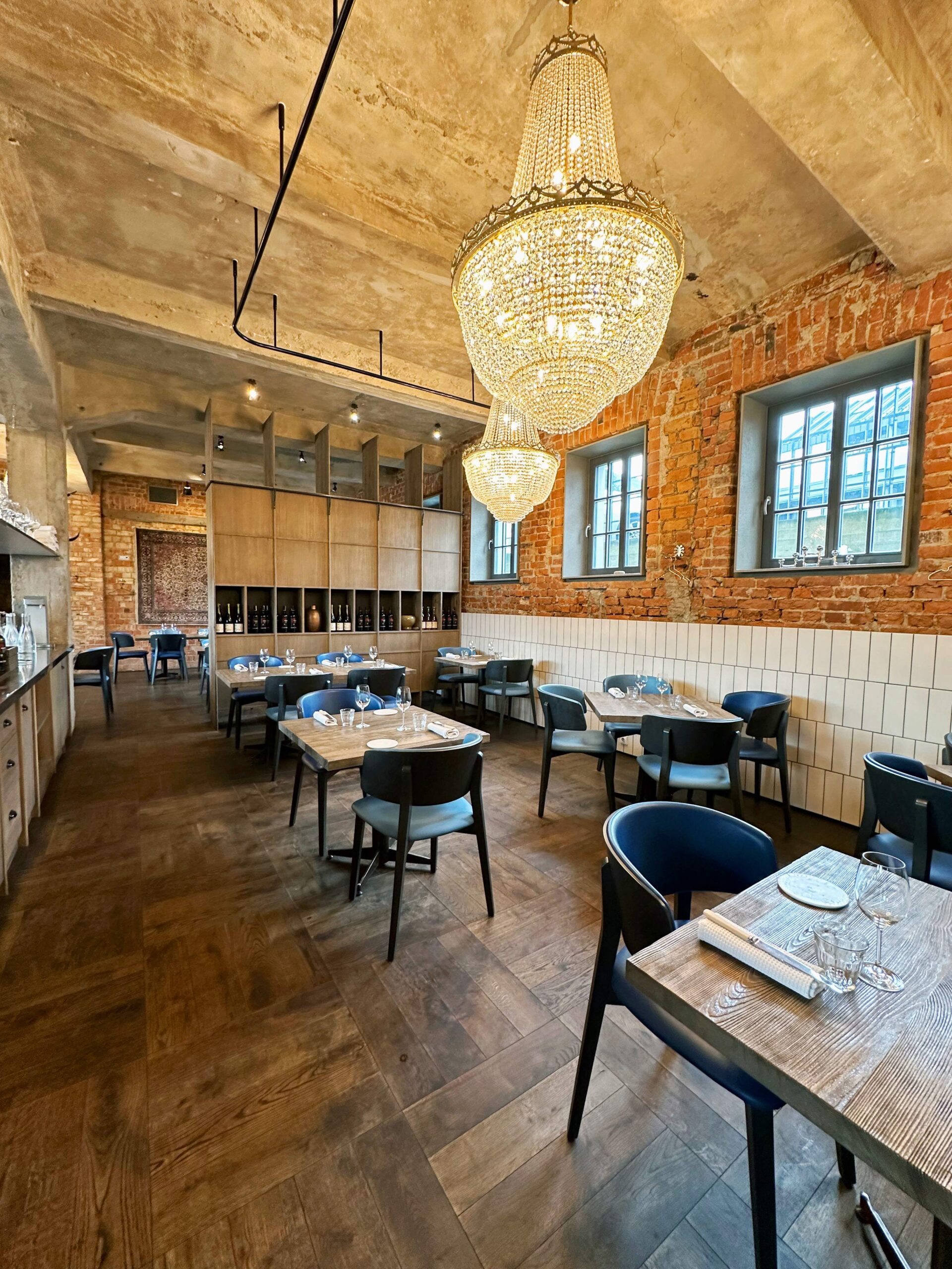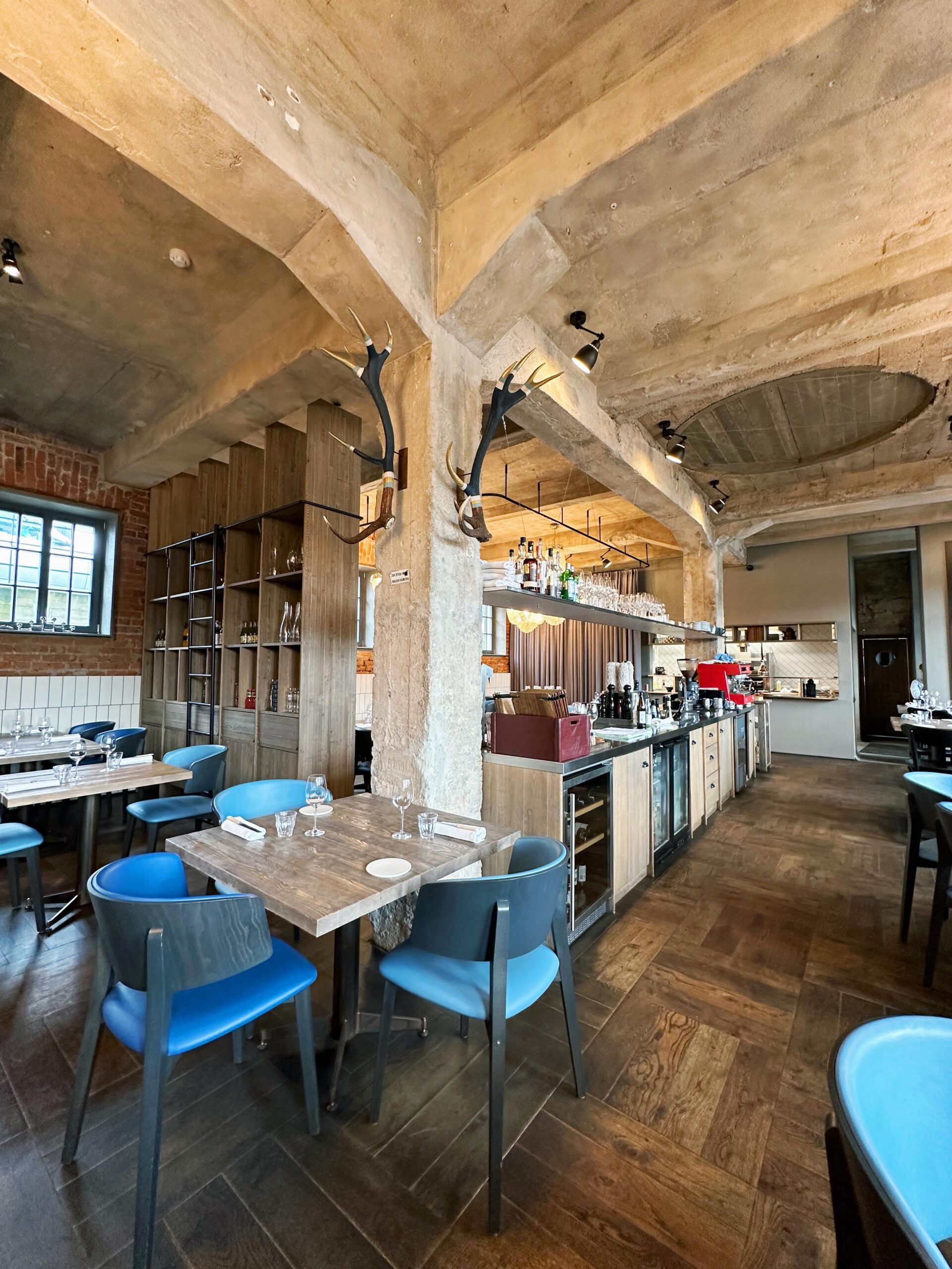 Интерьер зала оформлен в стиле лофта: кирпичные стены отлично гармонируют с синими стульями. Зал имеет несколько зон, а при желании часть зала можно отделить шторой — получится небольшая зона для частного мероприятия. В MOMO Grill кухня открытого типа: можно наблюдать, как готовят ваш заказ.