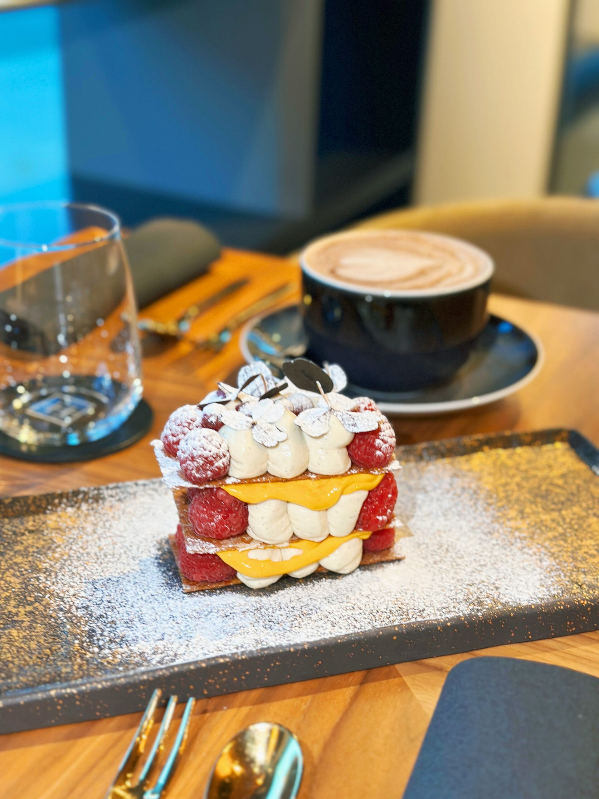 – десерт Mille feuille с малиной, облепихой и ванильным кремом.