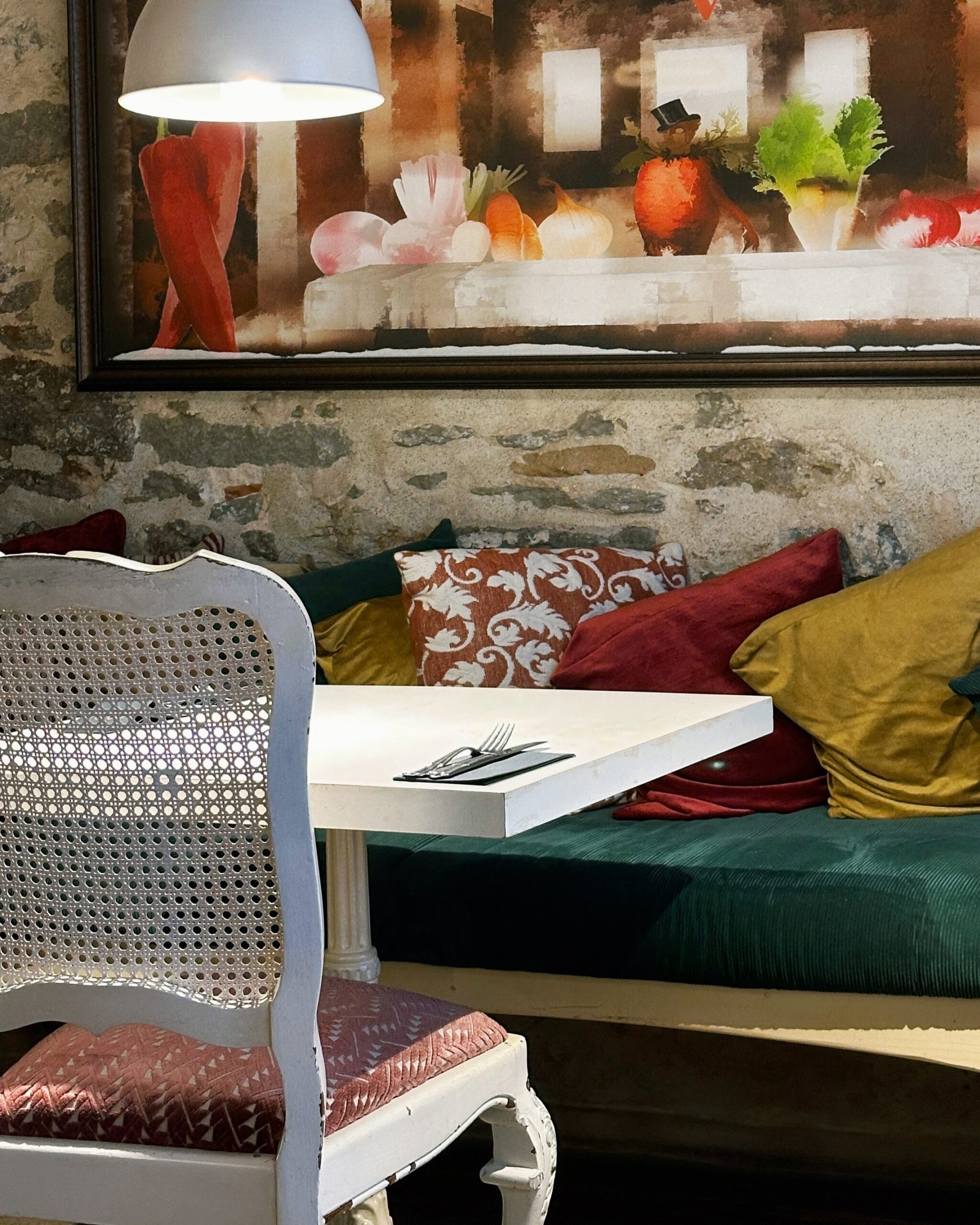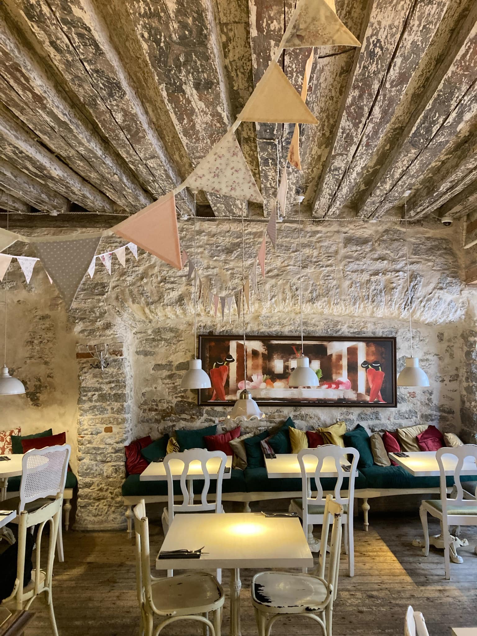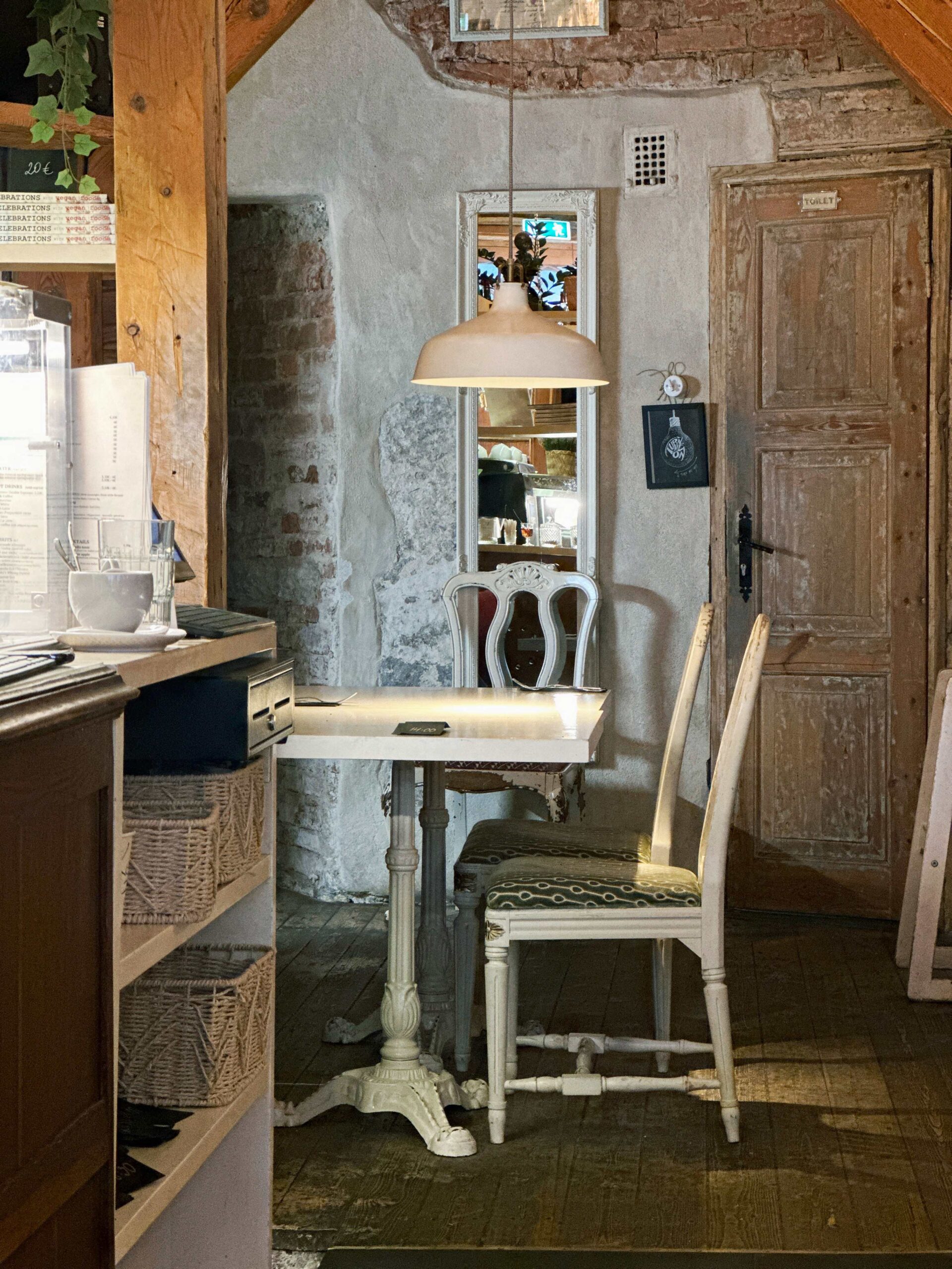The cozy hall vibes with a special atmosphere embracing the rich history of the city itself: aged doors, brickwork, wooden structures. The interior also features many interesting details, paintings, soft vintage chairs and other lovely accents.