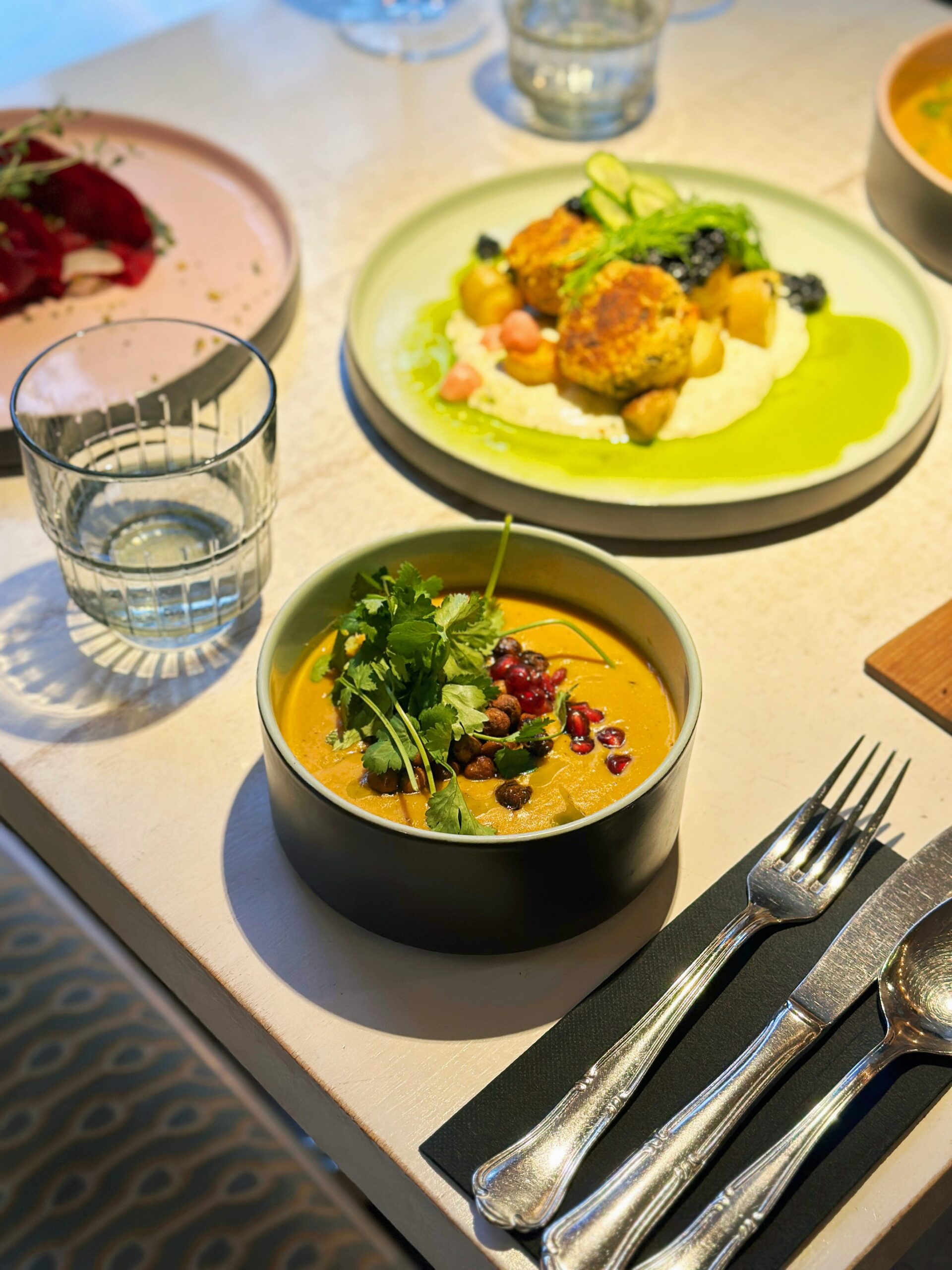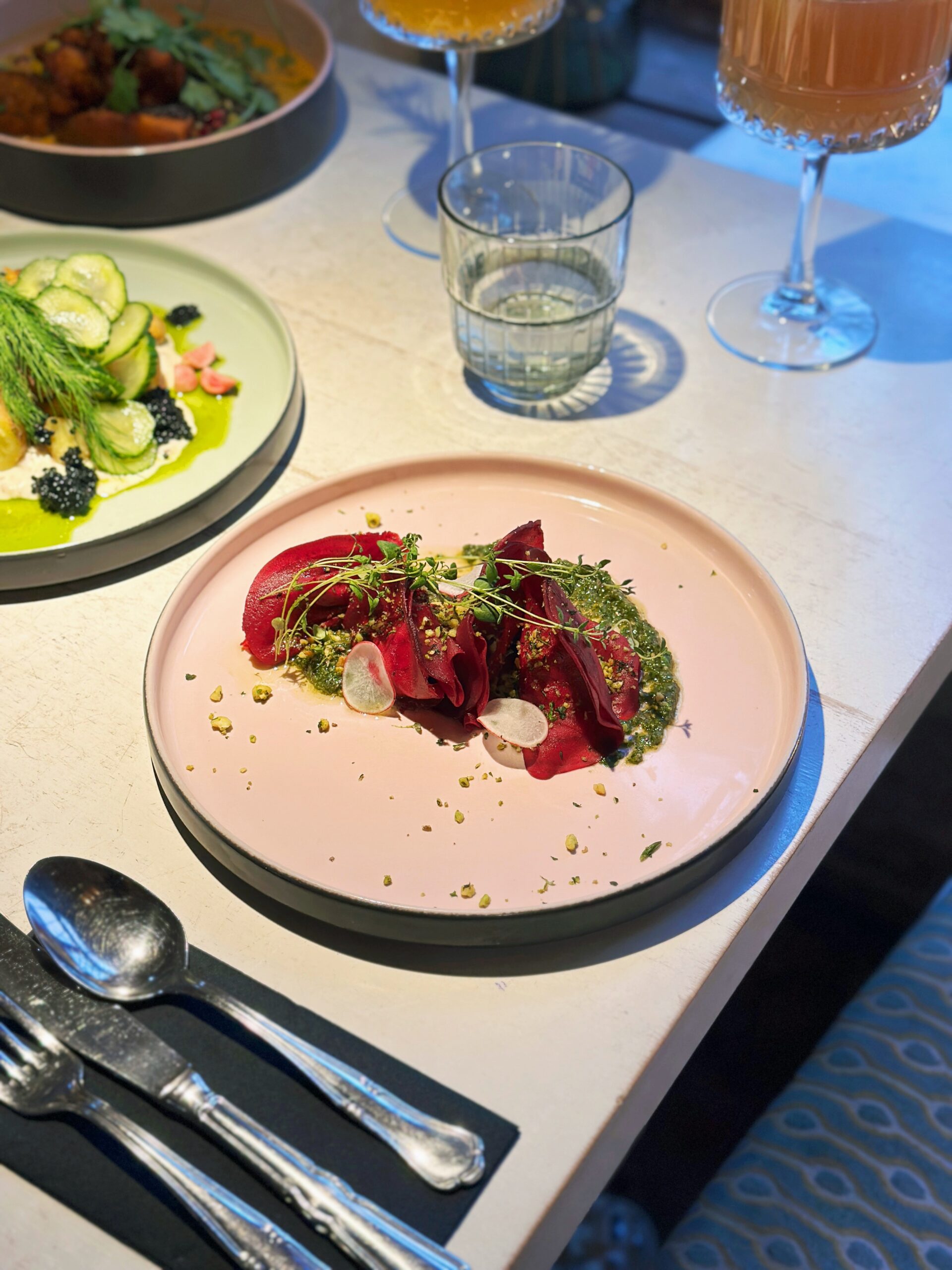 – signature beetroot ravioli with cashew cream and basil pesto,
